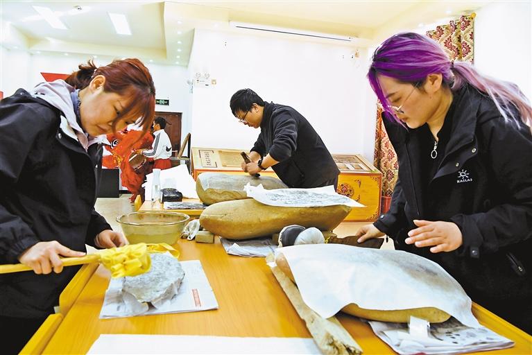 復旦大學圖書館中華古籍保護研究院師生在昌都市洛隆縣歷史文化陳列館內拓印當地石刻。洛桑 攝