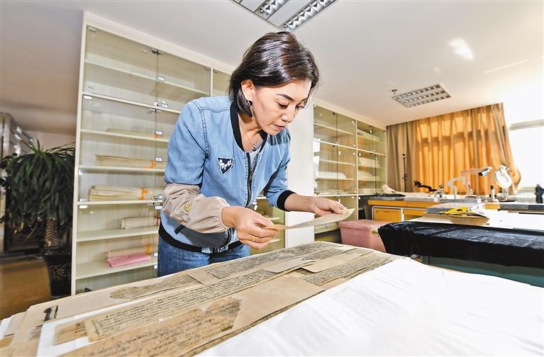 西藏自治區(qū)圖書館古籍保護中心工作人員在清理修復古籍。唐斌 攝