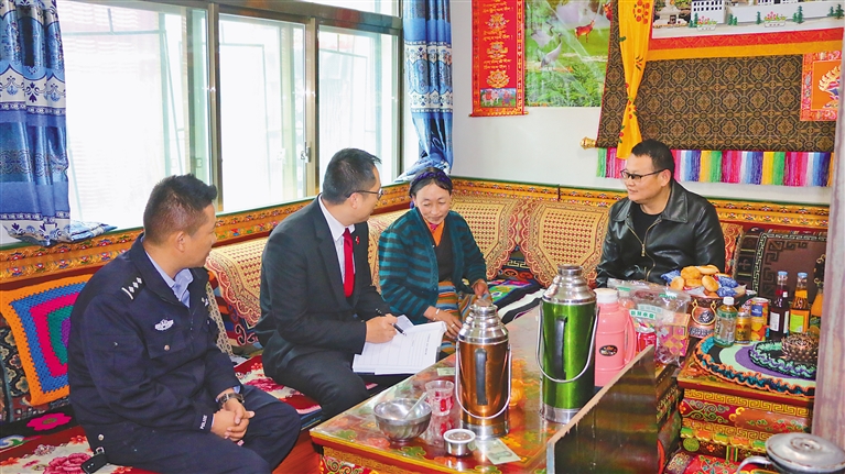 普瑪江塘中心法庭負責人巴桑次仁(左)正在向務(wù)工人員了解相關(guān)情況。