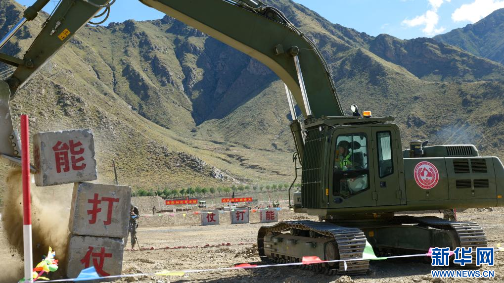 圖為比武隊員操作推土機(jī)推磚塊(9月26日攝)。新華網(wǎng)發(fā) 程思楊 攝