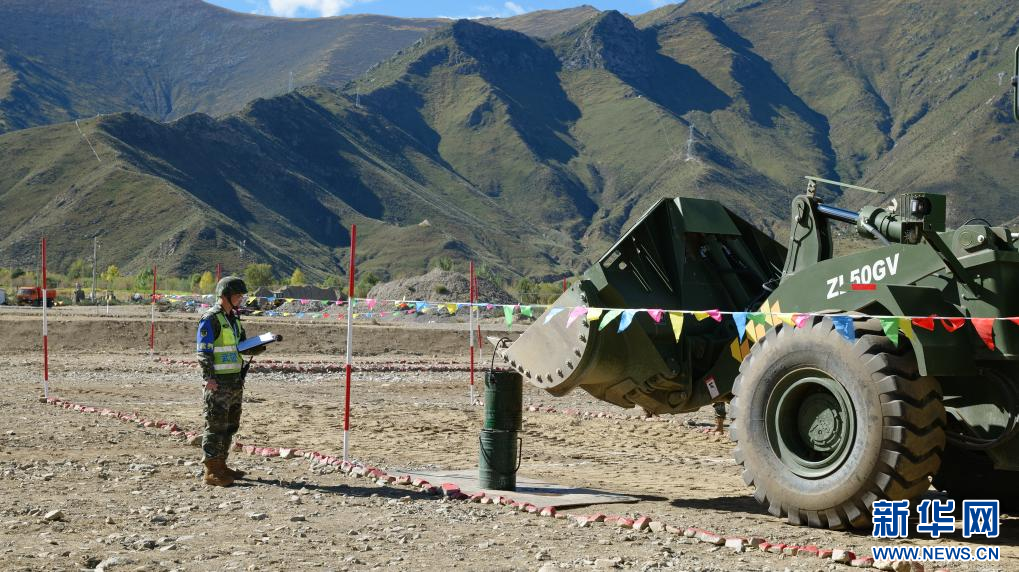 圖為比武隊員操作裝載機(jī)壘油桶(9月25日攝)。新華網(wǎng) 柑丹鴦琦 攝