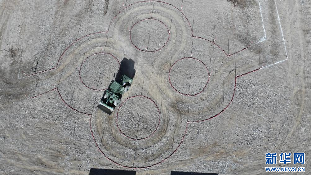 9月26日,比武隊員操作裝載機(jī)繞“8”字行駛(無人機(jī)照片)。新華網(wǎng)發(fā) 陸文凱 攝