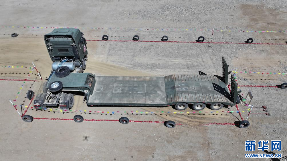 9月26日,比武隊員駕駛載重拖車“7”字??空九_(無人機(jī)照片)。新華網(wǎng)發(fā) 陸文凱 攝
