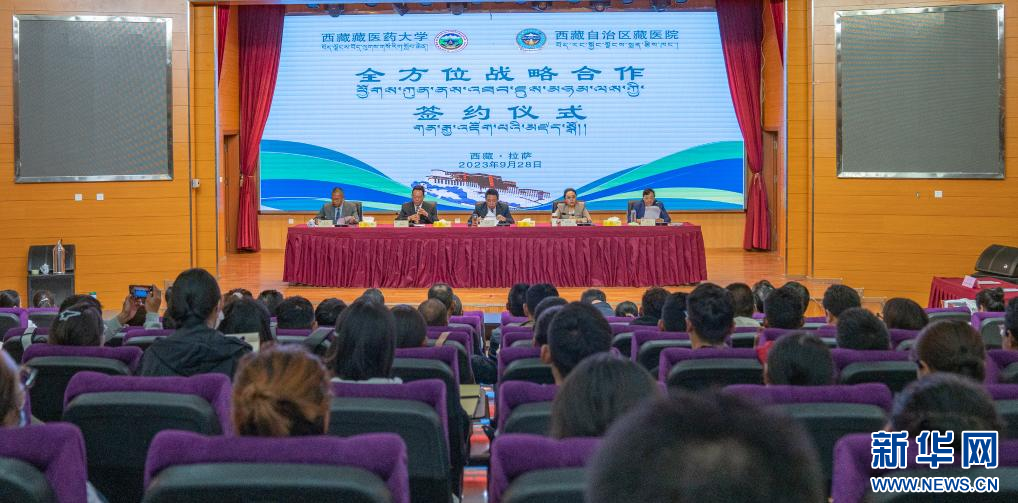 西藏藏醫(yī)藥大學與西藏自治區(qū)藏醫(yī)院全方位戰(zhàn)略合作簽約儀式現(xiàn)場(9月28日攝)。新華社發(fā)(丁增尼達攝)