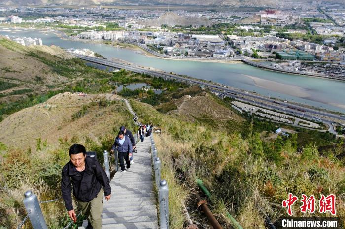 圖為9月28日,拉薩南山公園的登山者和遠(yuǎn)處的布達(dá)拉宮。中新社記者 江飛波 攝