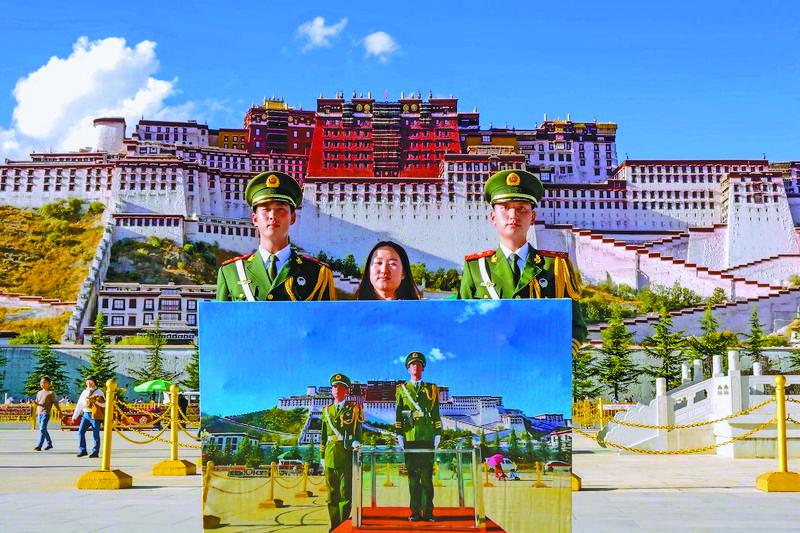 圖為青年畫家劉雪萍與執(zhí)勤哨兵在布達拉宮前合影。記者 格桑倫珠 攝