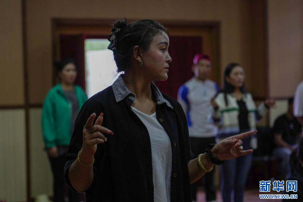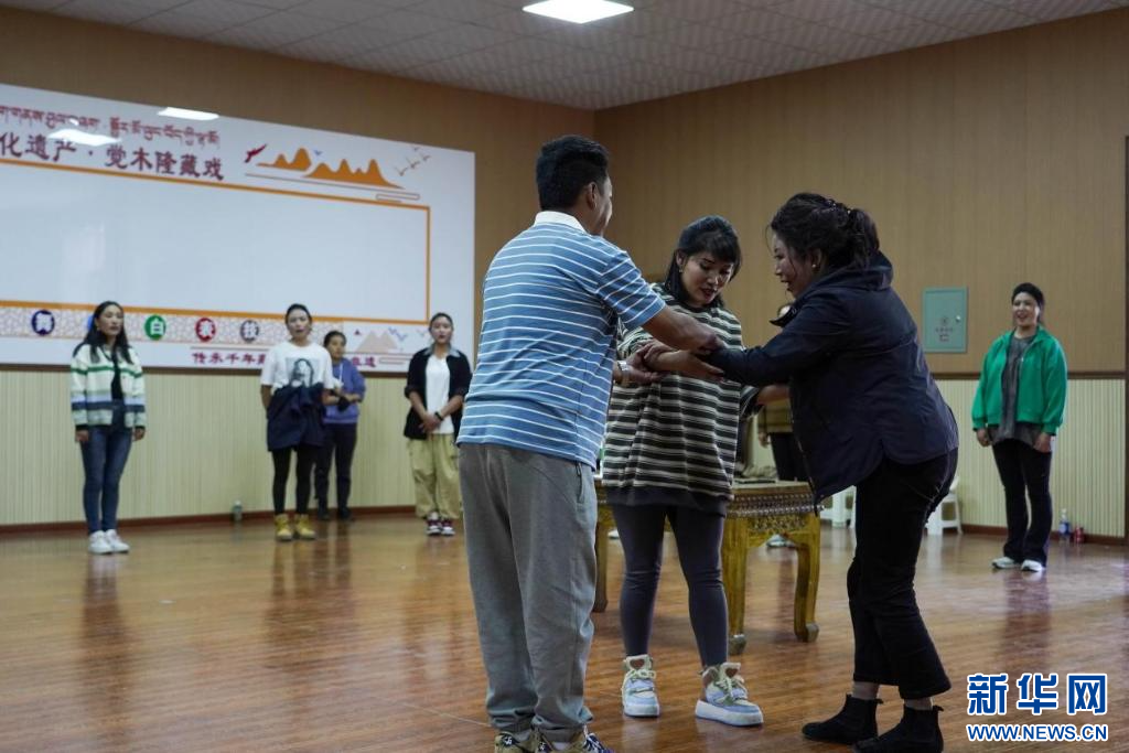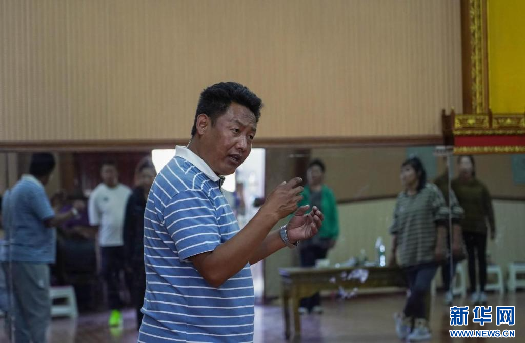 “像這樣,動(dòng)作幅度大一點(diǎn),我們?cè)賮?lái)一次?!迸啪毷依?,西藏自治區(qū)級(jí)非物質(zhì)文化遺產(chǎn)傳承人、覺木隆藏戲傳承人洛桑扎西正糾正演員們的動(dòng)作,伴隨著有力的鼓點(diǎn),藏戲《白瑪文巴》的排練正在進(jìn)行。