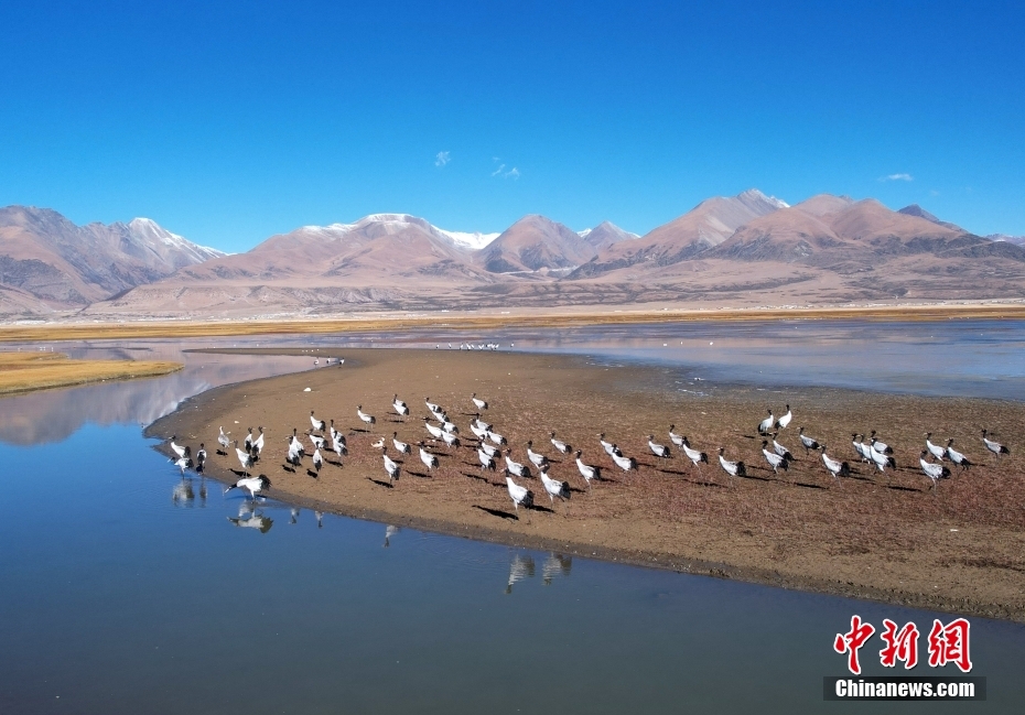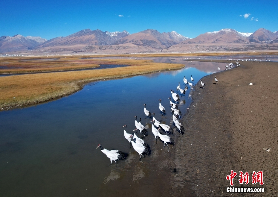 10月23日,成群的黑頸鶴在拉薩市當(dāng)雄縣阿熱濕地內(nèi)覓食。黑頸鶴是全球十五種鶴類中,唯一在高原地區(qū)繁殖和越冬的鶴類,屬中國國家一級保護(hù)野生動(dòng)物。