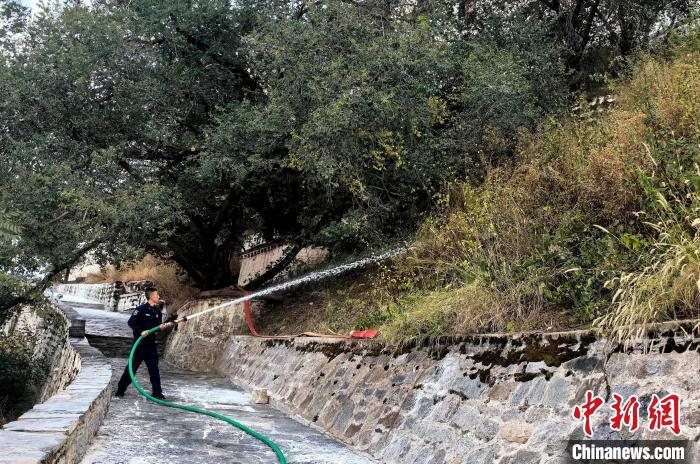 布達(dá)拉宮墻體粉刷正式開始前一周,大隊(duì)每日清晨、傍晚組織指戰(zhàn)員對(duì)布達(dá)拉宮山體進(jìn)行全面濕化,消除火災(zāi)隱患。劉瑜 攝