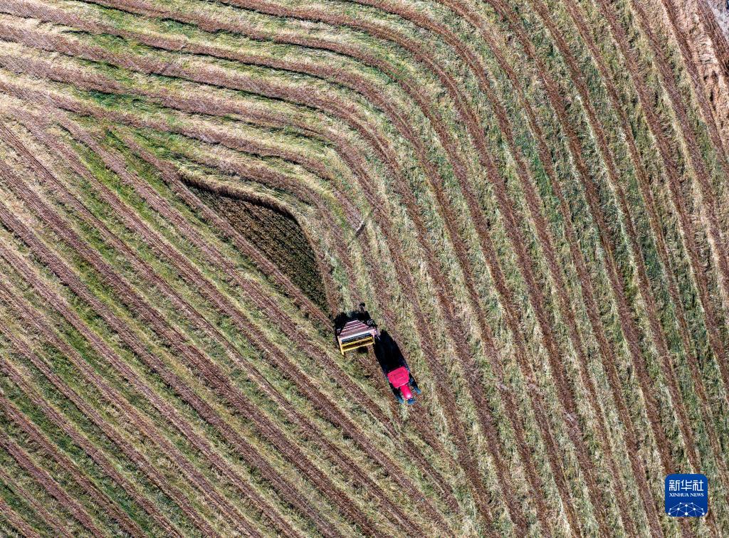 10月24日,村民駕駛農(nóng)機在拉薩市林周縣強嘎鄉(xiāng)曲嘎強村收割牧草(無人機照片)。新華社記者 姜帆 攝