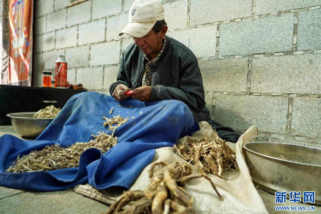圖為雪拉村村民正在為藏紙原料狼毒草去皮(10月20日攝)。新華網(wǎng)發(fā) 司秦菱 攝