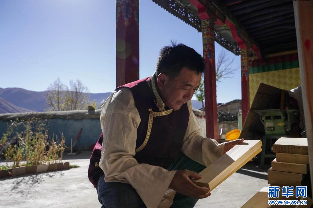 圖為嘎瑪曲扎正在挑選雕刻所用木板(10月21日攝)。新華網(wǎng)發(fā) 司秦菱 攝