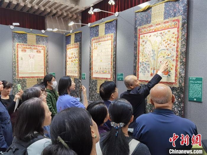11月1日,“藏醫(yī)唐卡精品展”在中國藏學(xué)研究中心西藏文化博物館正式開幕。圖為講解員為嘉賓介紹藏醫(yī)唐卡展品。 記者 徐雪瑩 攝