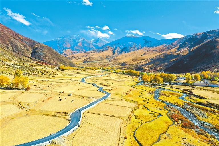 不僅如此,不管是往北通向唐嘎鄉(xiāng)的路,還是往南通向章多鄉(xiāng)的路,或是通往各個村莊的路,都在爭先恐后地訴說著金秋的美麗。道路兩旁聳立著金黃色的楊樹,陽光透過樹葉,散落在道路上,一種靜謐而淡然的美,劃過車窗。