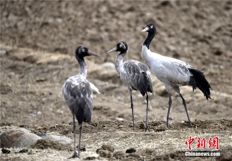 國家一級重點(diǎn)保護(hù)野生動物黑頸鶴在西藏拉薩楚布溝的農(nóng)田覓食。李林 攝