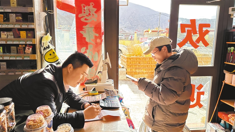 圖為多瑪鄉(xiāng)商戶劉世鵬(左)在為購(gòu)物者結(jié)賬。記者 婁夢(mèng)琳 攝