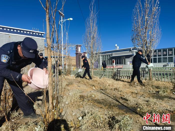 圖為魯魯邊境檢查站組織民警在營區(qū)周邊和查驗(yàn)通道附近開展冬灌排水、施肥等綠化養(yǎng)護(hù)工作。魯魯邊境檢查站供圖