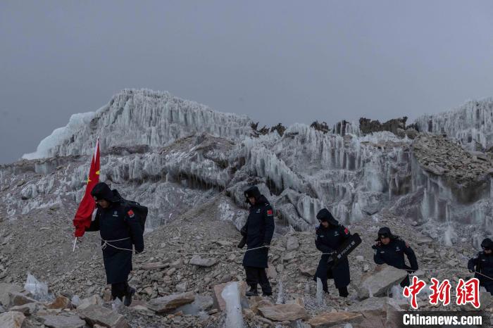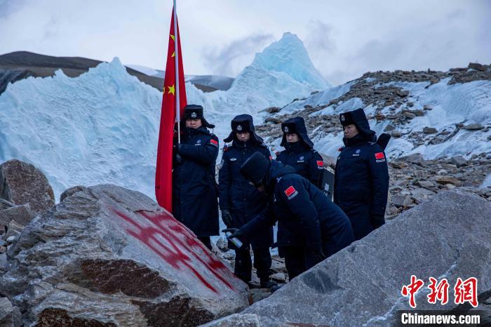 圖為普瑪江塘邊境派出所民警在海拔5600米的崗布冰川噴涂中國。郭遠敬 攝