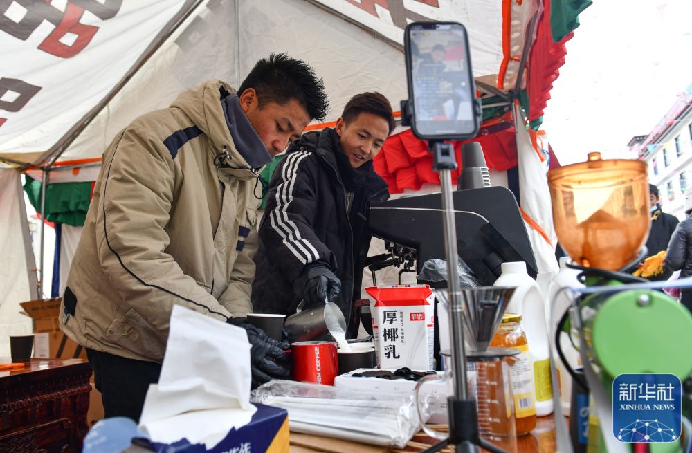 12月13日,西藏日喀則康馬縣冬季物資交流會上,幾名大學(xué)生在銷售現(xiàn)磨咖啡,并同步進(jìn)行網(wǎng)絡(luò)直播。