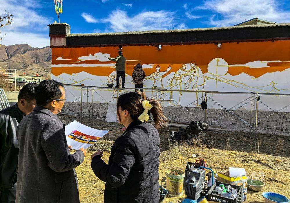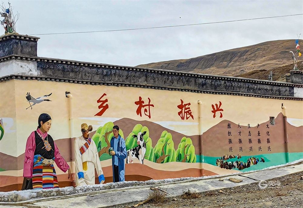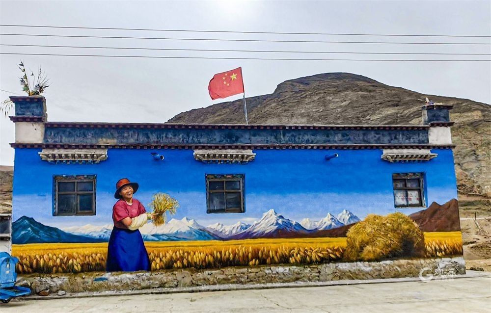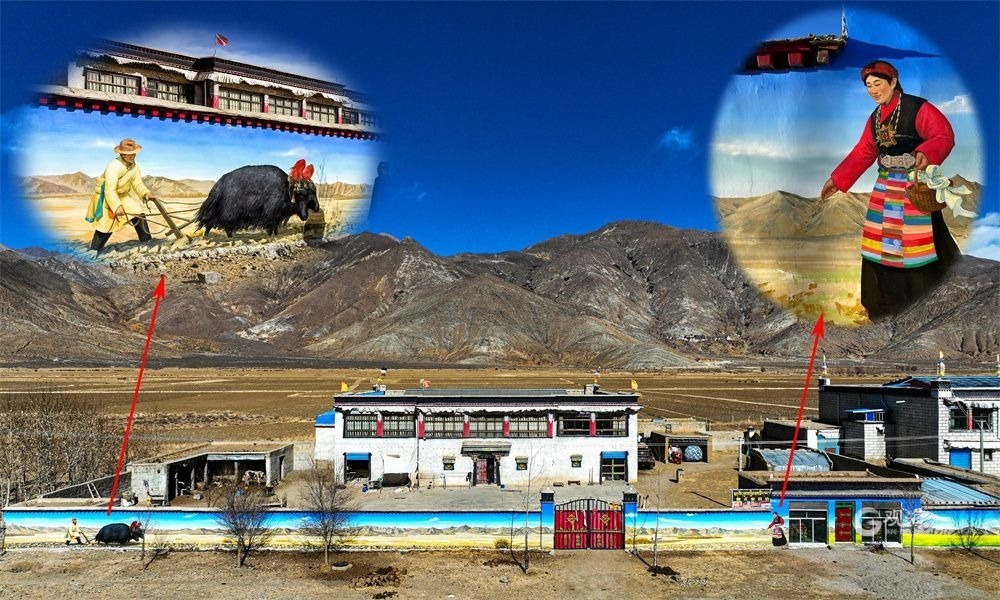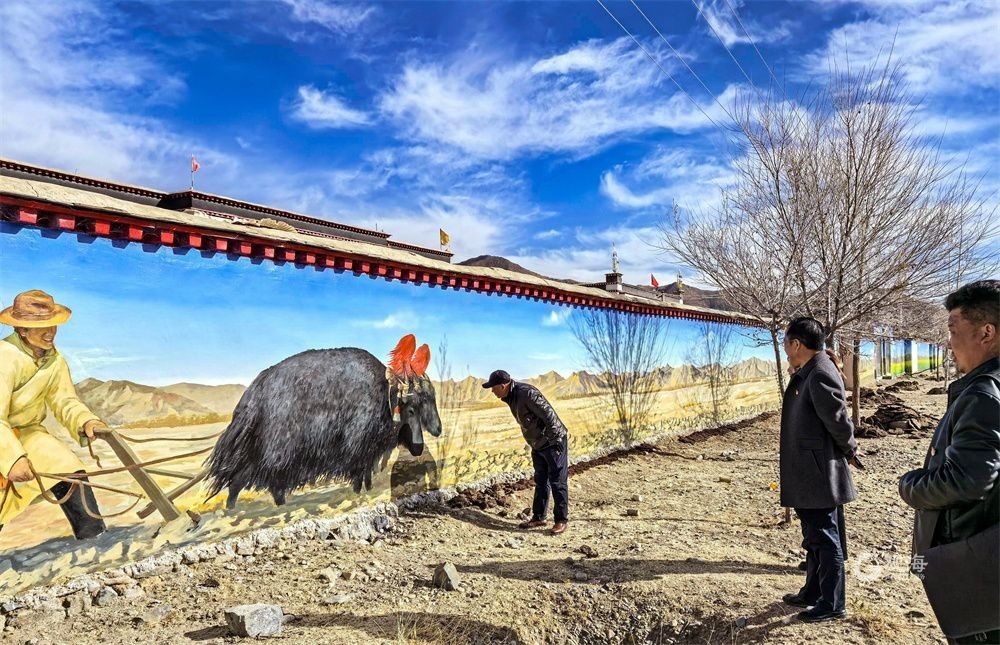 廣袤的高原上,在連綿起伏的山巒之下,是藏族農(nóng)家趕著傳統(tǒng)的“二牛抬杠”耕耘的場景,旁邊的“阿佳”則撒下希望的青稞種子……這樣的場景當(dāng)然不會出現(xiàn)在現(xiàn)在這個滴水成冰的季節(jié),而是躍然于藏家傳統(tǒng)村居的院墻之上?!拔壹疫@面墻原來就是貼滿了牛糞,現(xiàn)在畫上了我們平時勞動的景象,感覺比之前更好看了。”桑珠孜區(qū)東嘎鄉(xiāng)色定村的村民旦瓊說,此前的一年又一年,他都是把牛糞貼在墻上,固然有傳統(tǒng)的高原美感,但是與現(xiàn)在院墻上畫的鄉(xiāng)村振興的場景相比,還是現(xiàn)在的感覺更不錯。