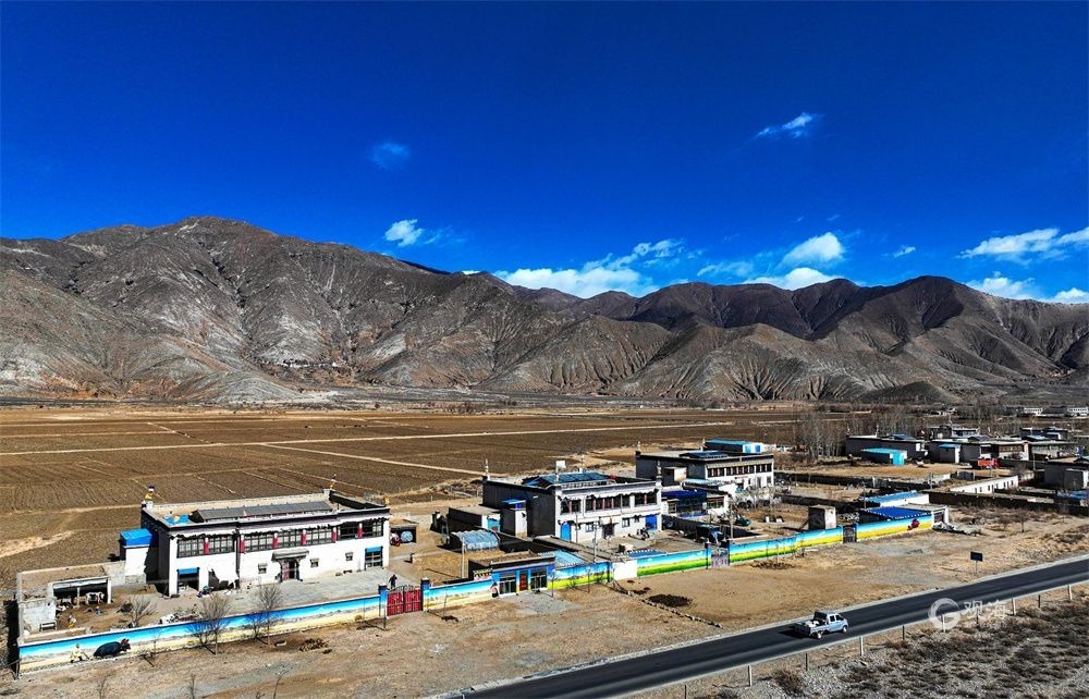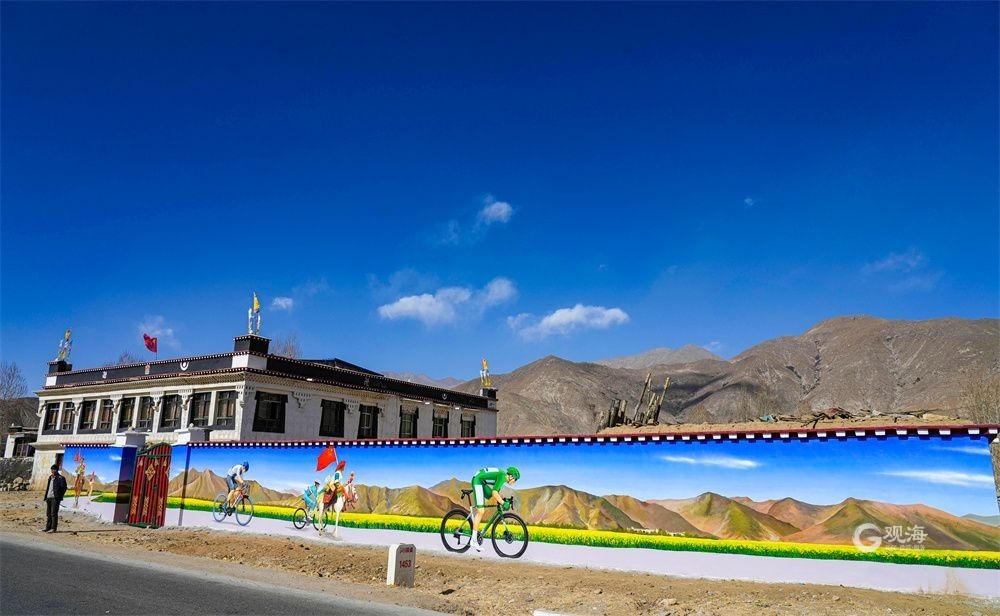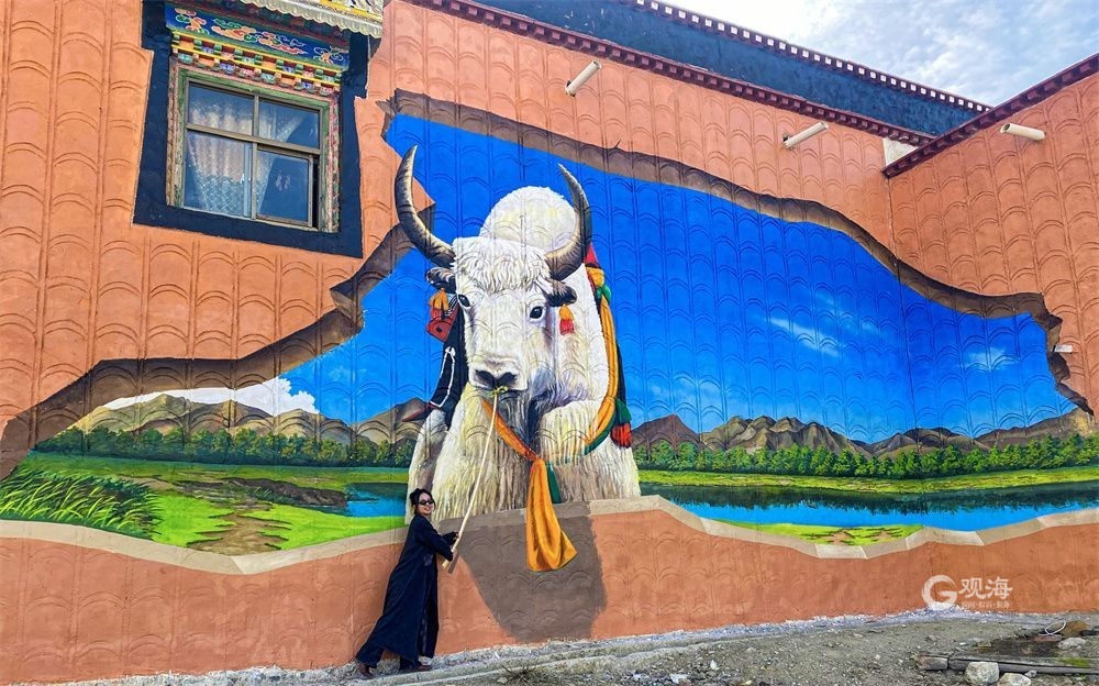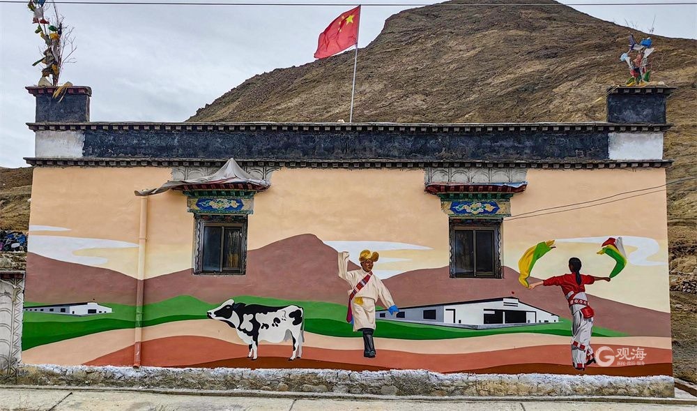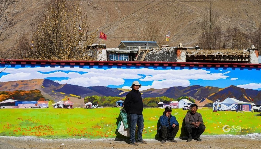 廣袤的高原上,在連綿起伏的山巒之下,是藏族農(nóng)家趕著傳統(tǒng)的“二牛抬杠”耕耘的場景,旁邊的“阿佳”則撒下希望的青稞種子……這樣的場景當(dāng)然不會出現(xiàn)在現(xiàn)在這個滴水成冰的季節(jié),而是躍然于藏家傳統(tǒng)村居的院墻之上?!拔壹疫@面墻原來就是貼滿了牛糞,現(xiàn)在畫上了我們平時勞動的景象,感覺比之前更好看了。”桑珠孜區(qū)東嘎鄉(xiāng)色定村的村民旦瓊說,此前的一年又一年,他都是把牛糞貼在墻上,固然有傳統(tǒng)的高原美感,但是與現(xiàn)在院墻上畫的鄉(xiāng)村振興的場景相比,還是現(xiàn)在的感覺更不錯。
