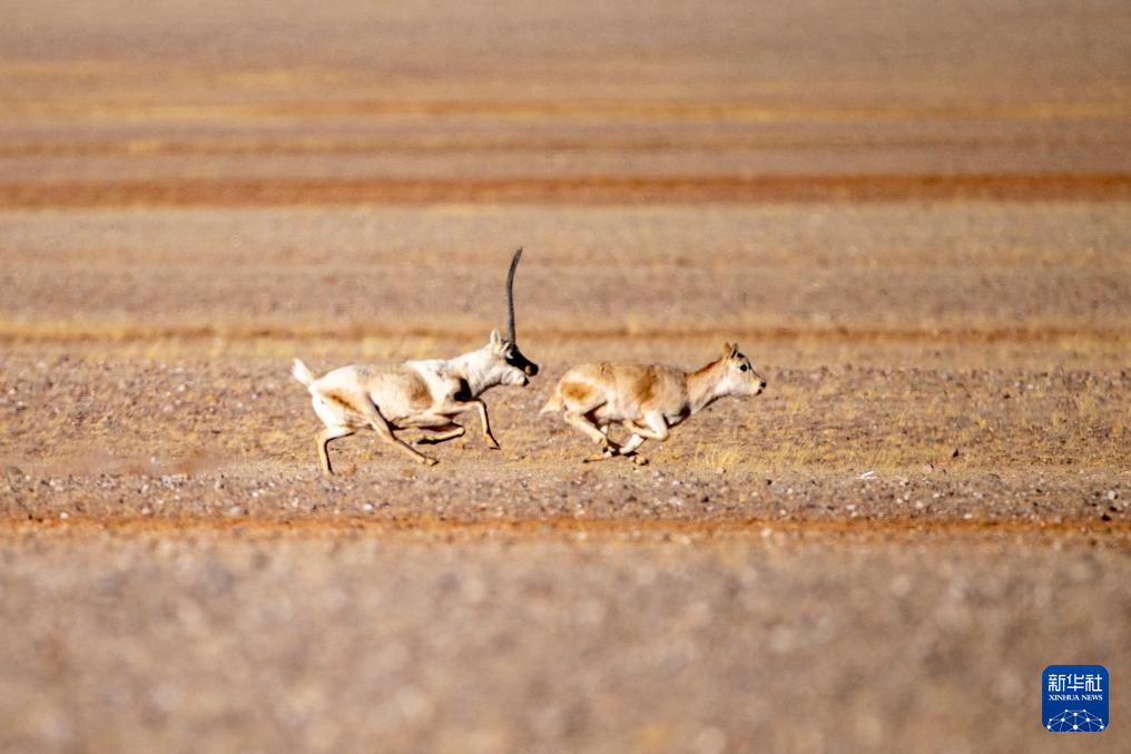 在羌塘國家級自然保護區(qū),兩只雄性藏羚羊為爭奪交配權而相互追逐(12月16日攝)。新華社發(fā)(旦增努布 攝)