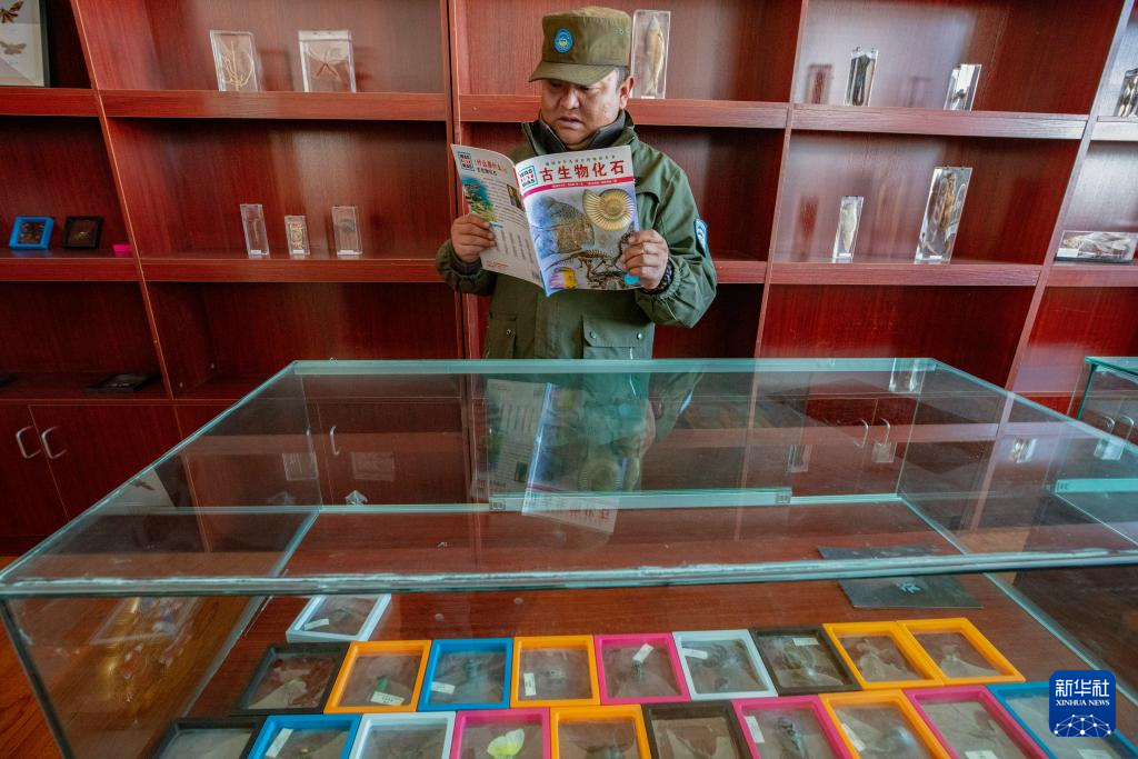 格桑倫珠在站里收集的化石標(biāo)本前看書(12月21日攝)。新華社記者 姜帆 攝