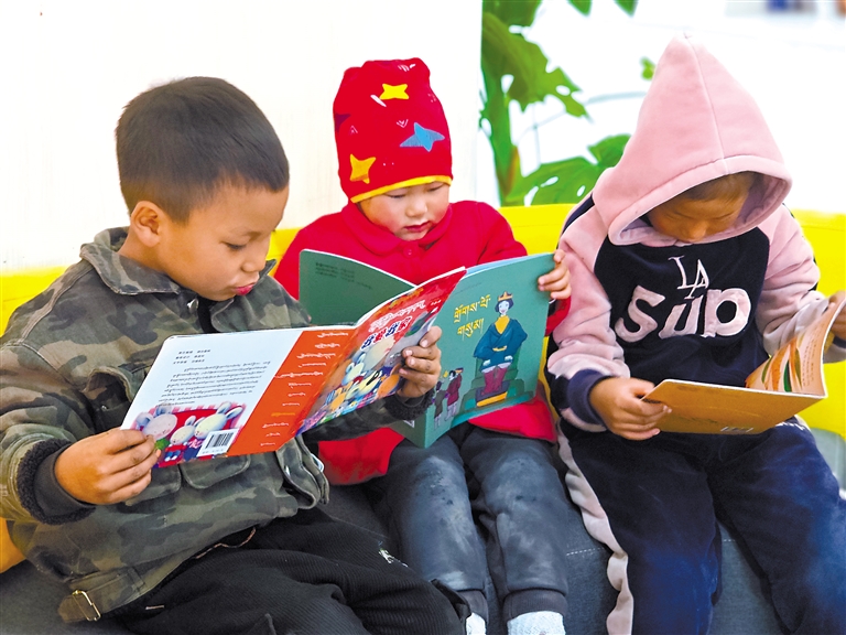 扎拉村的孩子在新時代文明實踐志愿服務(wù)隊成員的輔導(dǎo)下閱讀藏文繪本。謝筱純 王珊 攝