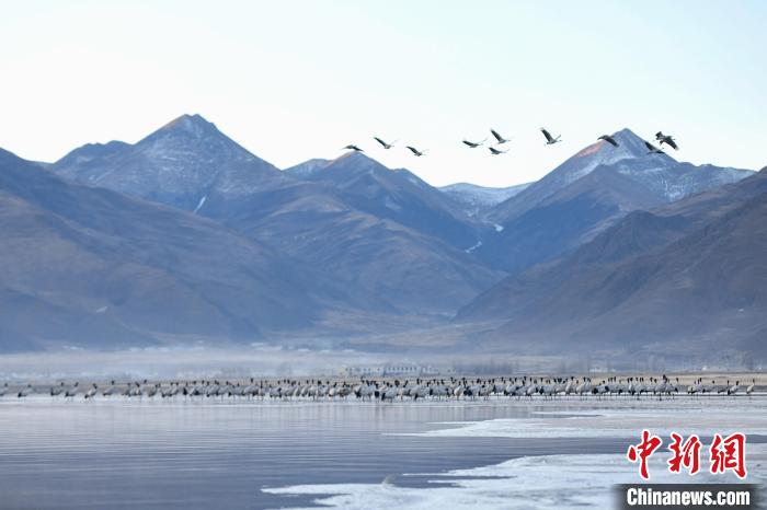 12月28日晨,西藏拉薩林周縣黑頸鶴保護(hù)區(qū)內(nèi),黑頸鶴覓食、嬉戲。拉薩北部的林周縣平均海拔約4200米,是黑頸鶴的主要越冬地之一。目前,到林周縣越冬的黑頸鶴已達(dá)2000只左右。近年來,西藏不斷加大黑頸鶴生存環(huán)境保護(hù)力度。據(jù)2022年冬季越冬黑頸鶴種群數(shù)量調(diào)查顯示,在西藏越冬的黑頸鶴種群數(shù)量達(dá)11175只,種群數(shù)量持續(xù)增長,并在西藏全區(qū)均有分布。據(jù)悉,黑頸鶴是全球15種鶴類中,唯一一種在高原地區(qū)繁殖和越冬的鶴類,也是分布在中國的9種鶴類中,唯一的中國特有鶴類,屬國家一級(jí)保護(hù)野生動(dòng)物。作為青藏高原濕地的“風(fēng)向標(biāo)”,黑頸鶴在生物多樣性保護(hù)工作中具有非常重要的地位。