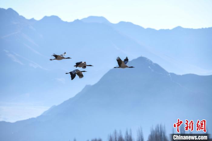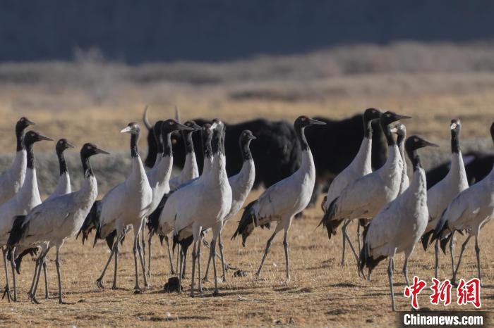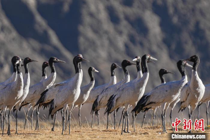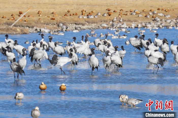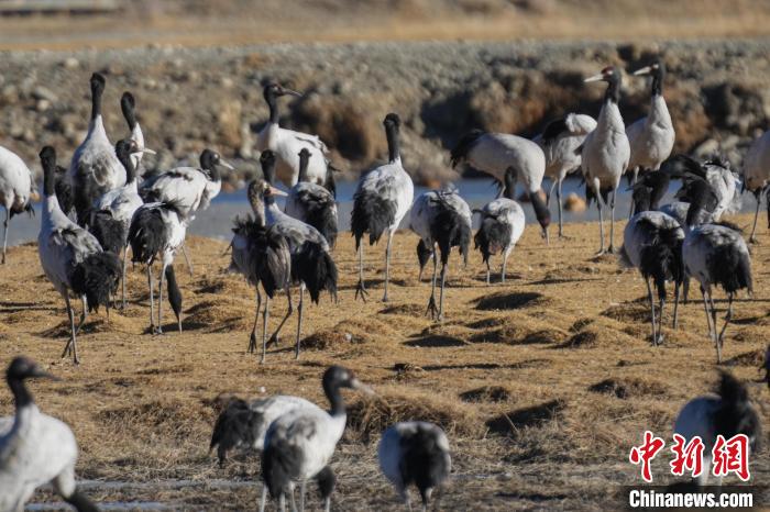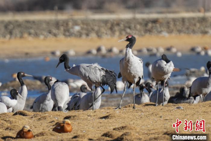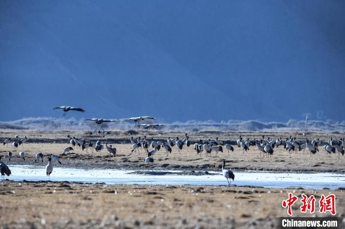 1月10日,西藏雅魯藏布江中游河谷黑頸鶴國家級自然保護區(qū)日喀則片區(qū)拉孜縣曲瑪鄉(xiāng)境內(nèi),大量越冬的黑頸鶴翩翩起舞,在濕地和農(nóng)田間覓食、嬉戲。近年來,隨著國家加大青藏高原生態(tài)保護力度,西藏多措并舉實施生態(tài)建設(shè),廣大農(nóng)牧民民眾保護野生動物的意識不斷提升,黑頸鶴及其棲息地得到了較好的保護,黑頸鶴數(shù)量逐年遞增。據(jù)悉,每年11月至次年3月,日喀則市拉孜縣、謝通門縣、桑珠孜區(qū)等地都會有黑頸鶴在此棲息過冬,最高數(shù)量達到8000只左右。