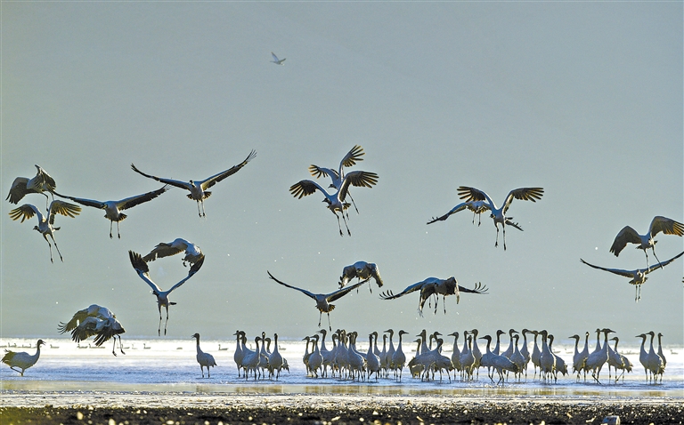 圖為林周縣境內(nèi)的黑頸鶴在冬日朝陽下嬉戲。記者 潘多 攝