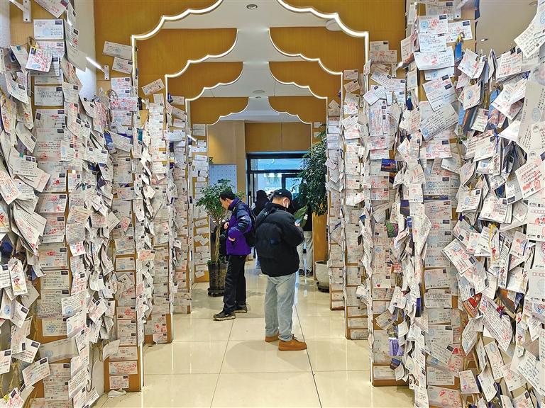 圖為游客在參觀獨(dú)具特色的“天上西藏”主題郵局明信片墻。記者 洛桑 攝