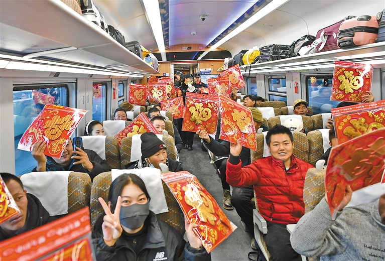 過年返鄉(xiāng)的乘客展示福字。記者 次仁平措 攝