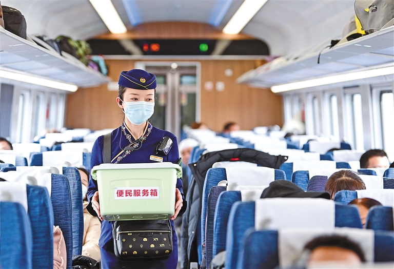 1月30日,中國鐵路青藏集團有限公司西寧客運段動車隊乘務員王璐在為旅客服務。新華社記者 張龍 攝