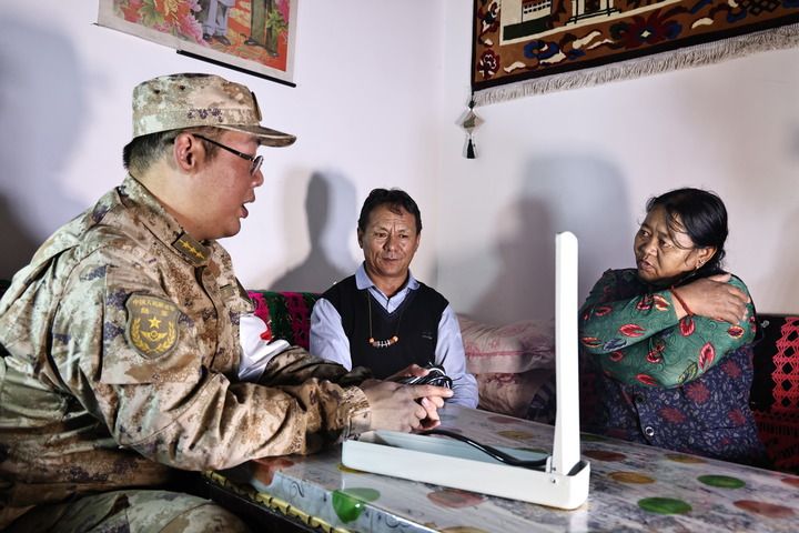 阿里軍分區(qū)某邊防團(tuán)扎西崗邊防連軍醫(yī)給當(dāng)?shù)厝罕娍床。?023年9月27日攝)。新華社發(fā)(李思鑫 攝)