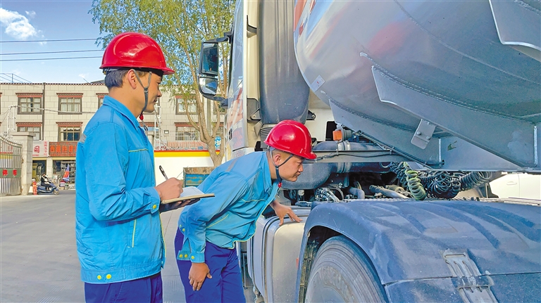 中國石油運輸西藏分公司工作人員在對油罐車輛進(jìn)行安全檢查。記者 次仁平措 通訊員 格桑旦增 攝