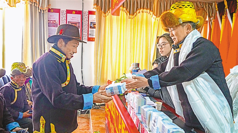 乃東區(qū)頗章鄉(xiāng)布仁村2023年集體經(jīng)濟(jì)分紅款達(dá)30余萬元,惠及全村101戶群眾。圖為村民在領(lǐng)取分紅款。