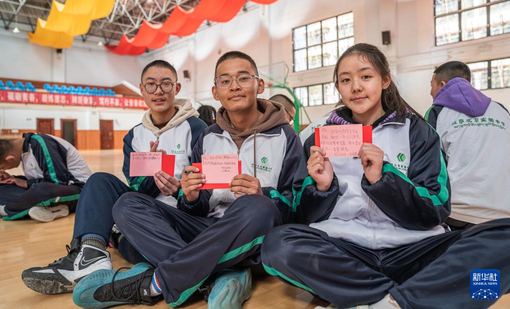 3月1日,拉薩北京實(shí)驗(yàn)中學(xué)的學(xué)生展示寫好的新學(xué)期愿望。新華社記者 丁增尼達(dá) 攝