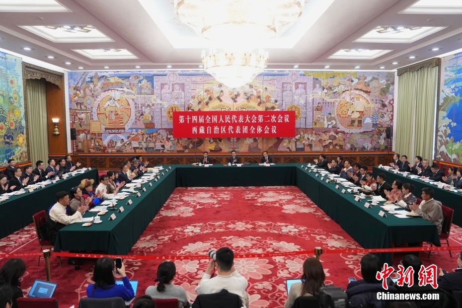 3月6日,出席十四屆全國(guó)人大二次會(huì)議的西藏代表團(tuán)在北京人民大會(huì)堂西藏廳舉行開放團(tuán)組會(huì)議,審議政府工作報(bào)告并回答記者提問。