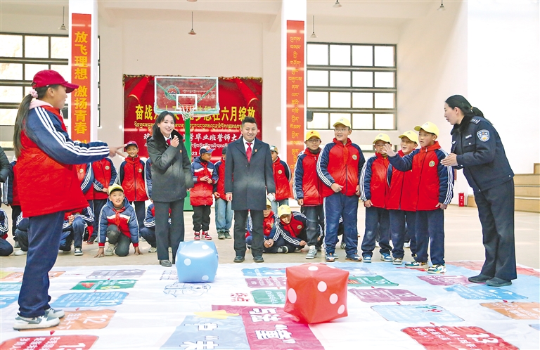 圖為3月5日,瓊結(jié)縣人民法院干警們在瓊結(jié)鎮(zhèn)完全小學用游戲方式開展“法治第一課”活動。倫珠澤仁 記者 洛桑 攝