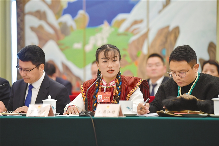 圖為3月6日上午,西藏代表團(tuán)舉行全體會(huì)議,傳達(dá)學(xué)習(xí)習(xí)近平總書記在參加江蘇代表團(tuán)審議時(shí)的重要講話精神,繼續(xù)審議政府工作報(bào)告,審查計(jì)劃報(bào)告和預(yù)算報(bào)告。圖為全國(guó)人大代表扎西尼瑪(中)在會(huì)上發(fā)言。
