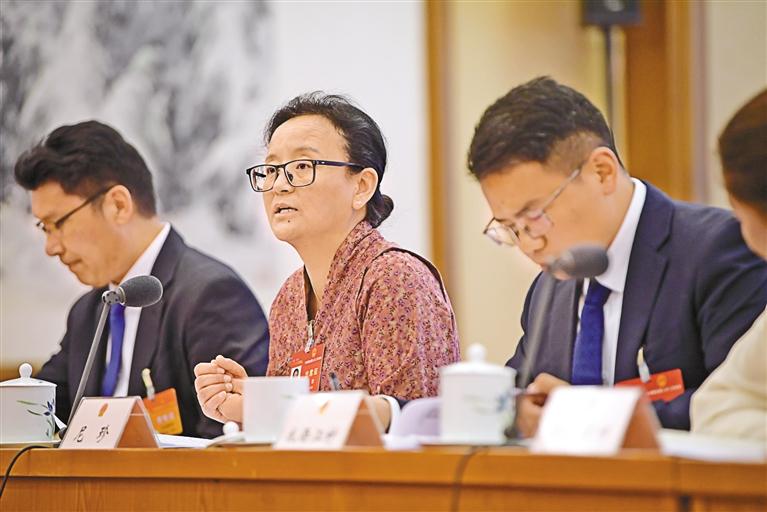 圖為3月7日,西藏代表團(tuán)舉行全體會議,傳達(dá)學(xué)習(xí)習(xí)近平總書記在看望參加全國政協(xié)十四屆二次會議的民革、科技界、環(huán)境資源界委員并參加聯(lián)組會議時(shí)的重要講話,審議國務(wù)院組織法修訂草案,繼續(xù)審查計(jì)劃報(bào)告和草案、預(yù)算報(bào)告和草案。圖為尼珍代表在會上進(jìn)行討論發(fā)言。 旦增西旦 攝