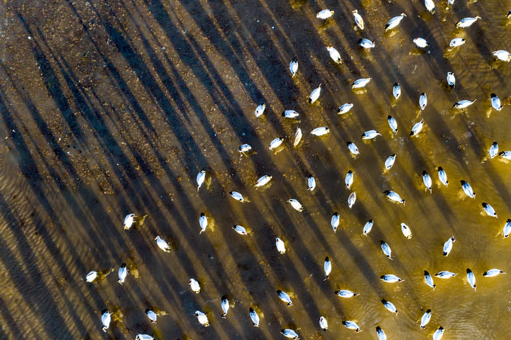 這是2023年12月5日清晨在拉薩市林周縣虎頭山水庫(kù)拍攝的越冬黑頸鶴(無(wú)人機(jī)照片)。新華社記者 姜帆 攝