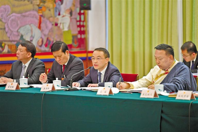 圖為西藏全國人大代表王方紅(右二)在西藏代表團全體會議上發(fā)言。