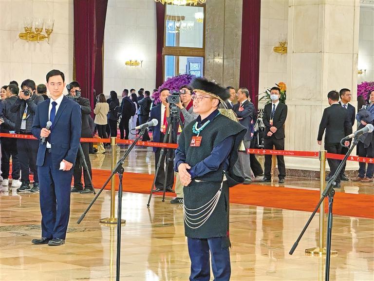 圖為西藏全國人大代表扎西江村在“代表通道”回答記者提問。