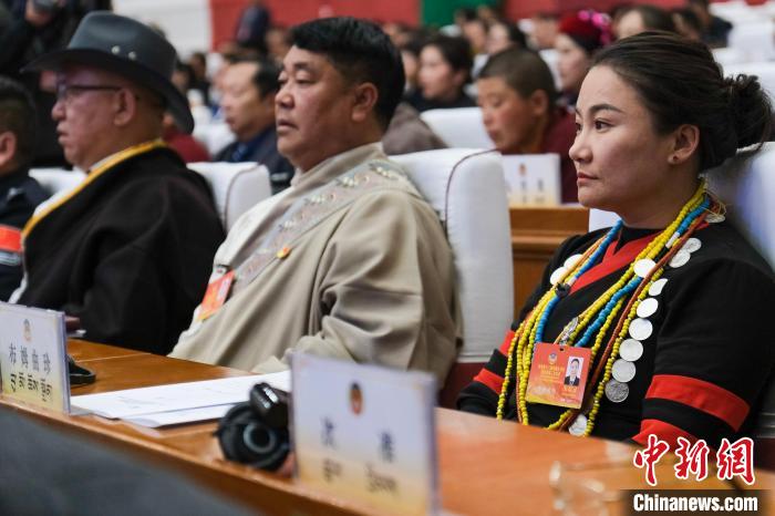 資料圖為2024年1月9日,西藏自治區(qū)兩會(huì)期間,少數(shù)民族界政協(xié)委員、墨脫縣達(dá)木珞巴民族鄉(xiāng)女鄉(xiāng)長布姆曲珍(右一)在拉薩參會(huì)。江飛波 攝