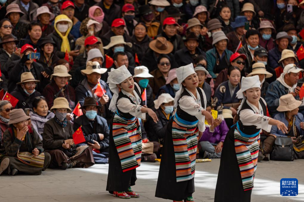 3月28日,群眾在拉薩市宗角祿康公園內觀看文藝演出,慶祝西藏百萬農奴解放65周年。新華社記者 姜帆 攝