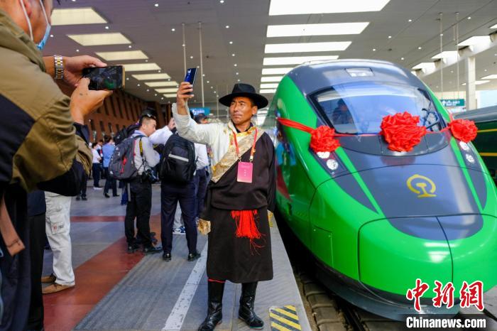 資料圖為2021年6月25日,西藏拉林鐵路開通運營,拉薩曲水縣三有村村民次旦平措在復興號前拍照留念。江飛波 攝