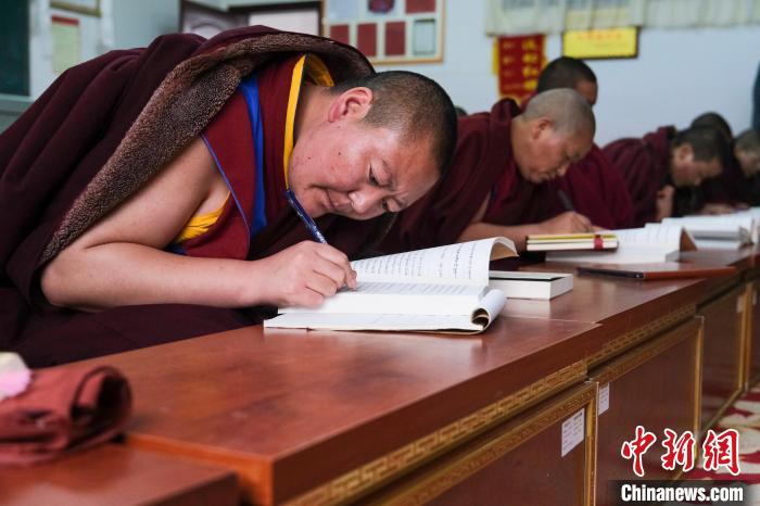 圖為3月28日,西藏佛學院20級尼眾(3)班學員在學習經(jīng)文。江飛波