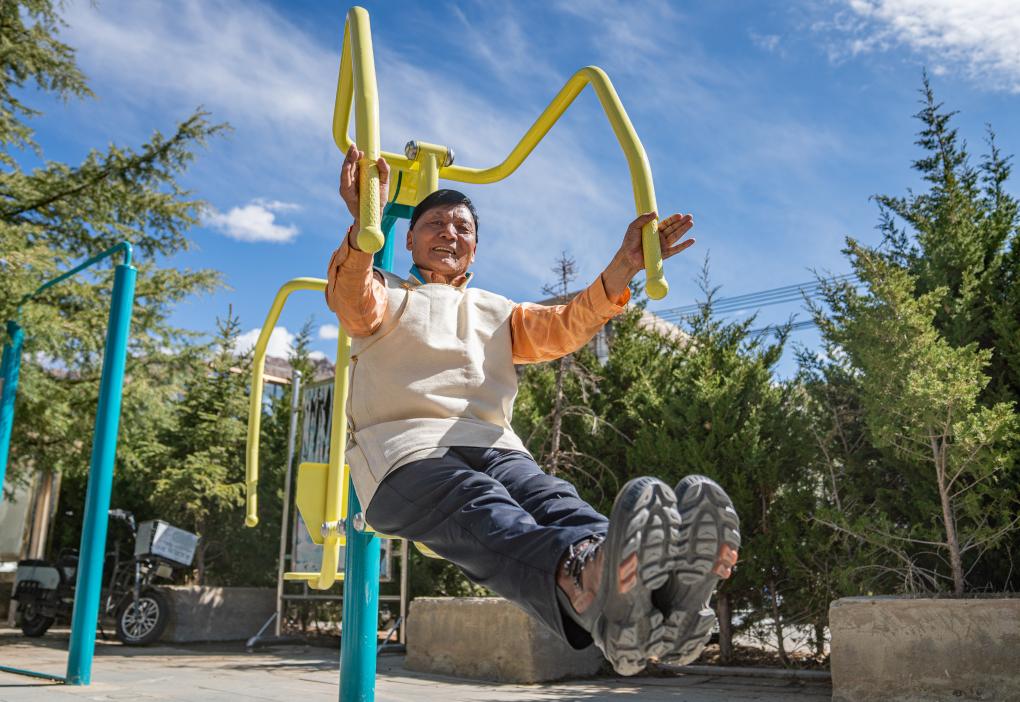 普次仁在小區(qū)健身(3月23日攝)。新華社記者 丁增尼達 攝